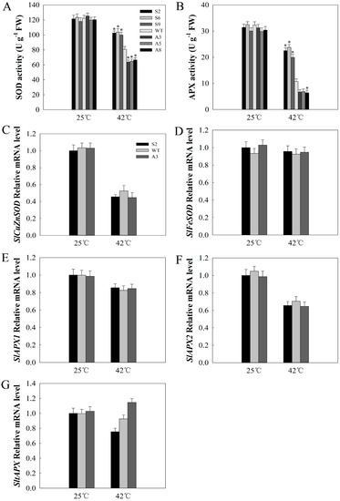 Under normal conditions, no obvious difference in SOD and APX activities was detected between WT and transgenic lines. After 42 °C treatment for 12 h, SOD and APX activities decreased in different degrees. However, compared with WT lines, the decrease range in SOD and APX activities in the sense lines was smaller, whereas that in antisense lines was larger (Figure 8A,B). To investigate the reason for changes in enzyme activity, the expressions of SlCuZnSOD, SlFeSODSl, SlAPX1, SlAPX2, and SltAPX were detected via qPCR. As shown in Figure 8C–G, under normal conditions, the expression levels of SlCuZnSOD, SlFeSODSl, SlAPX1, SlAPX2, and SltAPX showed no obvious difference among sense, WT, and antisense lines. After heat treatment for 12 h, the expression levels of SlCuZnSOD, SlFeSODSl, SlAPX1, SlAPX2, and SltAPX were drastically reduced, but there was also no obvious difference among sense, WT, and antisense lines. These results indicate that the low ROS accumulation in the sense plants was due to the high levels of SOD and APX activities via SlDnaJ20 overexpression.