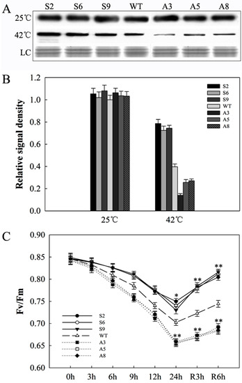 A total of 28 individual phosphinothricin-resistant transgenic tomato lines (T2) were collected from tissue culture, including 16 sense lines and 12 antisense lines. Six sense (S1, S2, S4, S6, S8, and S9) and antisense (A1, A3, A4, A5, A7, and A8) T2 lines were selected for qPCR to detect the expression level of SlDnaJ20 in transgenic lines. Compared with wild-type (WT) plants, the SlDnaJ20 transcription level in the tested sense pants increased by 12.9-, 65.0-, 44.9-, 32.2-, 25.7-, and 10.6-fold, whereas that in the antisense plants decreased by 0.37-, 0.20-, 0.47-, 0.27-, 0.30-, and 0.67-fold (Figure 5A). Among these transgenic lines, S2, S6, S9, A3, A5, and A8 were selected for Western blot analysis. The profile of SlDnaJ20 protein levels was similar to that of the transcript levels (Figure 5B,C). Therefore, S2, S6, S9, A3, A5, and A8 were selected for subsequent studies.