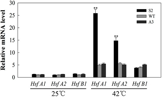Quantitative PCR analysis of HsfA1, HsfA2, and HsfB1 expression before and after heat stress. Six-week-old WT and transgenic plants were used for treatment under 42 °C for 12 h. The mean values ± SD of at least three replicates are presented, and ** p < 0.01 indicate significant differences compared with the control.