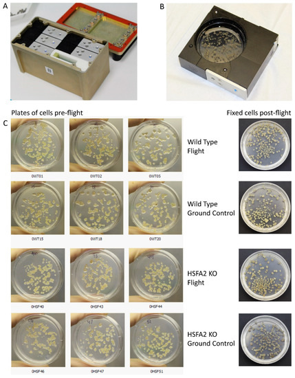 The BRIC hardware and cells flown in the BRIC17 CEL (Cellular Expression Logic) experiment. (A) A single BRIC (Biological Research in Canisters) hardware unit, showing five PDFUs (Petri Dish Fixation Unit) and a slot for a HOBO™ data logger; (B) A single PDFU containing a Petri dish of Arabidopsis callus cells; (C) Examples of replicate plates of wild type and HSFA2 KO cells from the spaceflight and ground control prior to loading into the PDFUs, along with representative photos of the fixed cells post-flight.