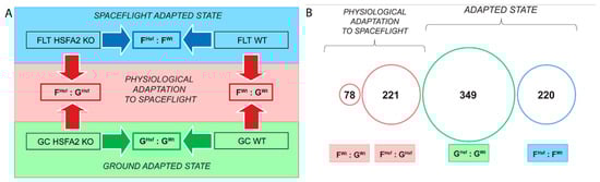 Graphical presentation of the dimensions used in the microarray data analysis and the results of thereof. (A) HSFA2 KO and WT mark the gene expression profiles for respective cell samples. Solid arrows represent the direction of comparison of the gene expression profiles. Red box and arrows indicate the first dimension of data analysis—gene expression profiles of spaceflight-adapted state to ground-adapted state for each of the two cell lines, thereby characterizing the physiological adaptation of each genotype to spaceflight. Green box and arrow indicate part of the second dimension of data analysis—a comparison of gene expression profiles between the two genotypes in the ground-adapted state, thereby defining the genes uniquely required by the two genotypes for ground-adapted state. Blue box and arrow indicate part of the second dimension of data analysis—a comparison of gene expression profiles between the two genotypes during spaceflight-adapted state, thereby defining the genes uniquely required by the two genotypes for spaceflight-adapted state; (B) A proportional graphical presentation of the significantly differentially expressed genes identified in each comparison group: 78 genes of the physiological adaptation to spaceflight in WT cells obtained from FWt : GWT; 221 genes of the physiological adaptation to spaceflight in HSFA2 KO cells obtained from FHsf : GHsf; 349 genes of the ground-adapted state between HSFA2 KO and WT cells obtained from GHsf : GWt group; 220 genes of the spaceflight-adapted state between HSFA2 KO and WT cells obtained from FHsf : FWt.