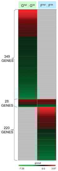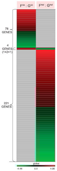 2.2.2. HSFA2 KO Cells Changed the Expression of Three Times More Genes than Seen in WT Cells—FHsf : GHsf