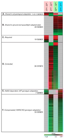 The heat map visualization of the selected significantly differentially expressed genes arranged by a specific expression patterns in the four comparison groups FWt : GWt, FHsf : GHsf, GHsf : GWt, FHsf : FWt. A through F designate a category for respective expression pattern. (A) genes were selected by presence among the physiological adaptation genes: 4 genes shared by the 78 of the physiological adaptation to spaceflight in WT cells obtained from FWt : GWt group comparison and 221 genes of the physiological adaptation to spaceflight in HSFA2 KO cells obtained from FHsf : GHsf group comparison; (B) genes were selected by presence among the ground and spaceflight-adapted state genes: 28 genes that showed the same differential expression pattern in the ground-adapted state between HSFA2 KO and WT cells obtained from GHsf : GWt group and in the spaceflight-adapted state between HSFA2 KO and WT cells obtained from FHsf : FWt; (C) genes were selected by presence among the WT physiological adaptation and ground-adapted state genes: 10 genes that showed the same differential expression pattern in the physiological adaptation to spaceflight in WT cells obtained from FWt : GWt comparison group and the ground-adapted state between HSFA2 KO and WT cells obtained from GHsf : GWt group. These genes were categorized as Required; (D) Genes were selected by presence among the HSFA2 KO physiological adaptation and ground-adapted state genes: 66 genes that showed opposite differential expression pattern in the physiological adaptation to spaceflight in HSFA2 KO cells obtained from FHsf : GHsf comparison group and the ground-adapted state between HSFA2 KO and WT cells obtained from GHsf : GWt group. These genes were categorized as Corrected; (E) Genes were selected by presence among the WT physiological adaptation and spaceflight-adapted state genes: 7 genes that showed the opposite differential expression pattern in the physiological adaptation to spaceflight in WT cells obtained from FWt : GWt comparison group and the spaceflight-adapted state between HSFA2 KO and WT cells obtained from FHsf : FWt group. These genes were categorized as HsfA2-dependent. In addition, reflect WT genotypic adaptation; (F) genes were selected by presence among the HSFA2 KO physiological adaptation and spaceflight-adapted state genes: 53 genes that showed the same differential expression pattern in the physiological adaptation to spaceflight in HSFA2 KO cells obtained from FHsf : GHsf comparison group and the spaceflight-adapted state between HSFA2 KO and WT cells obtained from FHsf : FWt group. These genes were categorized as Compensated, and reflect HSFA2 KO genotypic adaptation.
