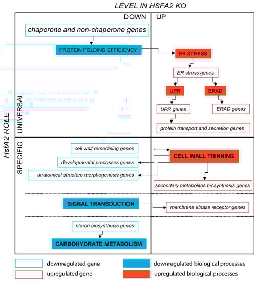 Graphical presentation of the identified processes associated with the universal stress response and specific roles of HSFA2 in spaceflight. The filled shapes represent the biological process; the unfilled shapes represent the genes; red color indicates upregulation/enhancement; blue color represents downregulation/decrease. Text in bold highlights the key specific functions.