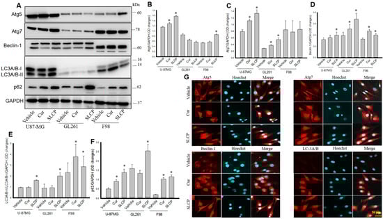 Changes of autophagy markers in GBM cells after treatment with Cur and or SLCP. (A–F): U-87MG, GL261, and F98 cells were treated with either Cur or SLCP (25 µM) for 24-h and then Western blots and immunocytochemistry (ICC) were performed. The Western blots data showed that there were significant increased levels of Atg5, Atg7, Beclin-1, LC3A/B, and p62 after treatment with SLCP and/or Cur. Values are represented as mean ± standard error of mean (SEM) from three independent observations. * p < 0.05 in comparison to the respective vehicle-treated group. (G): Immunocytochemisty (ICC) revealed apparent increases in ICC intensity of Atg5, Atg7, Beclin-1, and LC3/A/B in SLCP- and Cur-treated U-87MG cells in comparison to vehicle-treated cells. Scale bar indicates 50 µm and is applicable to all images.