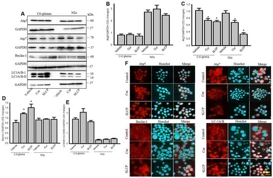 We did not observe any significant changes of Atg5 (Figure 2A,B) and LC3A/B levels (Figure 2A,E) after treatment with Cur and or SLCP treatment. In addition, we observed very little differences of Atg7 levels in C6-glioma cells, and there was a decrease in N2a cells (Figure 2A,C) after Cur and or SLCP treatment. In contrast, Beclin-1 was increased in C6-glioma, but not in N2a cells (Figure 2A,D) after Cur and or SCLP treatment. The ICC of Atg5, Atg7, Beclin-1, and LC3A/B in U-87MG also showed comparable results, as shown in the Western blots after Cur and/or SLCP treatment (Figure 2F).