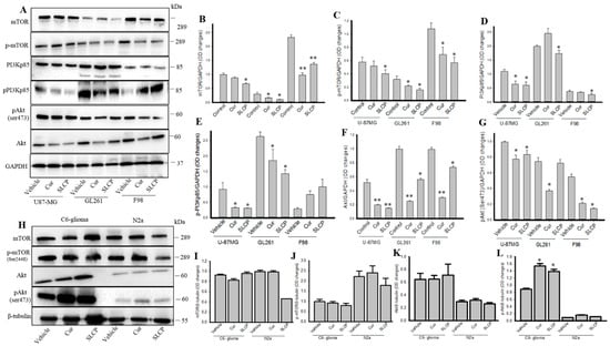 We observed that PI3Kp85, phosphoPI3Kp85, total Akt, p-AKT, mTOR, and p-mTOR levels were significantly decreased in U-87MG, GL261, and F98 cell lines after treatment with Cur and or SLCP (Figure 4A–D). SLCP showed greater inhibition of the PI3k-Akt/mTOR pathway than Cur. Whereas in the case of C6-glioma and N2a cells, this pathway was mostly unaltered (Figure 4G–K).