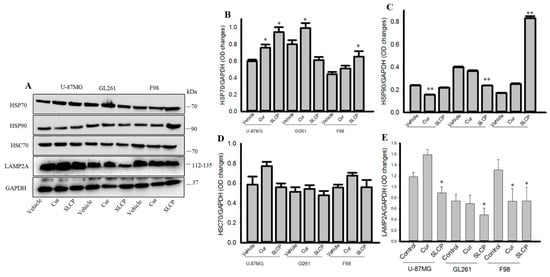 CMA markers, such as HSC70, were unaltered in all three GBM cell lines, but LAMP2A levels were significantly down-regulated after treatment with Cur and or SLCP (Figure 5A,D,E). In contrast, HSP70 was increased in all three cell lines after treatment with Cur and or SLCP (Figure 5A,B), and the HSP90 level was also diminished in U-87MG and GL261, but was increased in F98 cells treated with SLCP (Figure 5A,C).