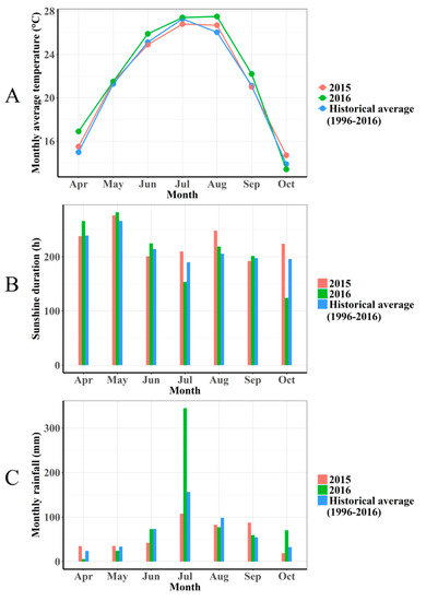 Meteorological data (monthly average temperature (A), sunshine duration (B), and rainfall (C)) of the experimental field from April to October in 2015–2016.