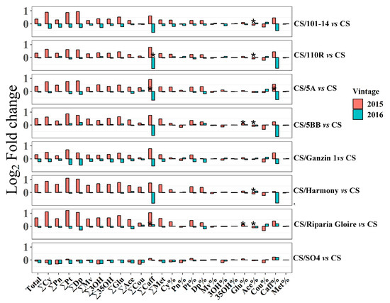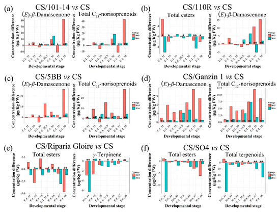 Effects of 101-14 (a), 110R (b), 5BB (c), Ganzin 1 (d), Riparia Gloire (e), and SO4 (f) on the volatile biomarkers in two seasons (2015–2016). Each data represent the concentration difference of volatile biomarkers between each grafted and own-rooted vines. The asterisk * in each bar indicates significant differences between grafted and own-rooted vines in the same season at the basis of student’s t-test at p < 0.05.