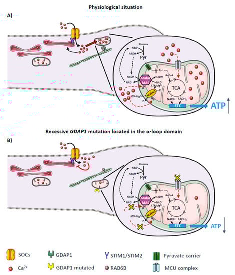 Effects of ganglioside-induced differentiation-associated protein 1 (GDAP1) on mitochondrial bioenergetic functions. (A) Interaction between GDAP1 and the trafficking proteins allows mitochondria to be located close to the plasma membrane after store-operated calcium entry (SOCE) activation, preventing its Ca2+-dependent inactivation. Ca2+ uptake by mitochondria facilitates SOCE but also regulates ATP production by oxidative phosphorylation. Ca2+-dependent regulation of OXPHOS involves two main mechanisms (dotted red arrows); (i) Ca2+ entry through the mitochondrial Ca2+ uniporter complex (MCUc) and the activation of dehydrogenases of the tricarboxylic acid cycle (TCA), and (ii) activation of the neuronal Ca2+-dependent mitochondrial transporters of aspartate/glutamate (Aralar) or ATP-Mg/Pi (SCaMC-3). Aralar activation increases Malate/Aspartate shuttle (MAS) activity, transferring reducing equivalents from NADH to mitochondria and thereby increasing pyruvate (Pyr) supply to mitochondria to enhance mitochondrial respiration. SCaMC-3 activation increases mitochondrial adenine nucleotide pool (solid and dotted black arrows); (B) Mitochondrial movement might be affected by recessive mutations located in the α-loop of GDAP1 causing the loss of interaction with trafficking proteins RAB6B and caytaxin which might affect the proper mitochondrial localization at the subplasmalemmal microdomains and disturb SOCE activity (red T bar). Subsequently, this will also impair mitochondrial bioenergetic functions by either decreasing Ca2+ uptake by MCUc and activation of matrix dehydrogenases, and/or by decreasing the activation of Ca2+-dependent mitochondrial transporters.
