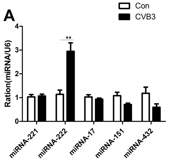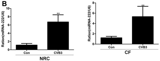 To explore the relations between miRNAs and the interaction of ADAR1 with Dicer, we used RT-qPCR to detect changes in microRNA-221, -222, -17, -151, and -432, which are related with the progress of virus infection and heart disease [27,28,29]. Compared with the control group, we found that the level of miRNA-222 was significantly higher; the others did not achieve statistical significance (Figure 4A). Based on changes in the miRNAs, we selected miRNA-222 and explored its role in NRC and CF. Interestingly, we found that miRNA-222 was also significantly elevated after infection with CVB3 compared with the control group (Figure 4B).