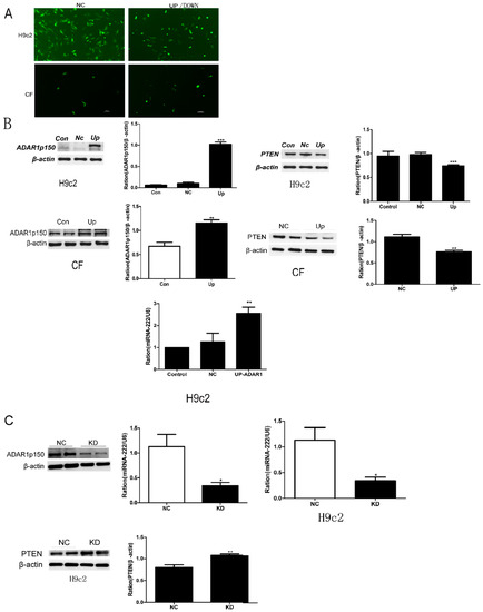Effects of ADAR1p150 on miRNA-222 synthesis in cultured cells and regulation of phosphatase-and-tensin (PTEN) expression by miRNA-222. (A) GFP as a marker protein was detected by immunofluorescence after 48 h transfection in the H9c2 cell line and CFs (cardiac fibroblasts). As shown in the picture, the transduction efficiency was always over 80%. (B) After confirming that ADAR1p150 high expression transfection was successful, miRNA-222 and PTEN were quantitatively or relatively quantified. (C) After inhibiting the expression of ADAR1P150, miRNA-222 and PTEN were quantitatively or relatively quantified. Data represent the mean ± SEM from the control (Con)and infected groups, negative control (NC)knocked down (KD), * p < 0.05, ** p < 0.01, *** p < 0.001.