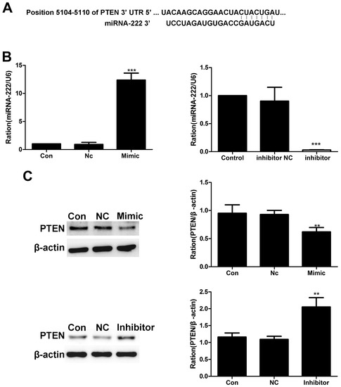 PTEN is a target protein of miRNA-222. (A) According to the principle of base pairing to deduce the binding of miR-222 to the predicted sequence in the 3′-UTR of mouse PTEN mRNAs, seven complementary sites were demonstrated. (B) We successfully transferred the mimic and inhibition of miRNA-222 into H9c2 cells, as determined by quantitative-PCR. (C) The change in PTEN protein in H9c2 cells when miRNA-222 was upregulated and downregulated, respectively. NC = negative control. Data represent the mean ± SEM from the Con and infected groups, ** p < 0.01, *** p < 0.001.