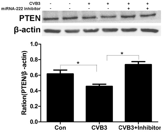 PTEN regulation by miRNA-222 in hearts of VMC mice. The PTEN expression was downregulated when H9c2 cells were infected with CVB3(* p < 0.05). When we co-transfected the miRNA-222 inhibitor, the effect of ADAR1p150 almost disappeared.