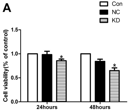 The cell counting kit-8 (CCK-8; Dojindo, Shanghai, China) was performed to measure the viability of cardiomyocytes. Briefly, equal amounts of cells were cultured in FBS (5%)-l-DMEM in 96-wellplates for 24 h and then treated with CVB3 for 24 or 48 h after ADAR1p150 was knocked down. According to the supplier’s instructions, 10 µL/well of CCK-8 was added to each well for a further 3 h incubation at 37 °C. The ELx808 Absorbance Microplate Reader with an optical density (OD) at 450 nm was used to calculate cell viability.