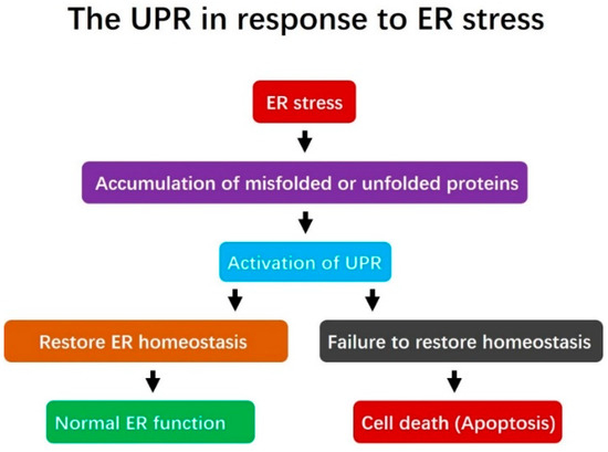 The role of the unfolded protein response (UPR) in addressing Endoplasmic Reticulum (ER) stress. Under ER stress, misfolded or unfolded proteins accumulate in the ER. This triggers activation of the UPR, which is a pro-survival response designed to alleviate the accumulation of misfolded proteins, restore ER homeostasis and re-establish normal ER function. However, if the UPR fails to restore ER homeostasis, cell death (apoptosis) is induced.