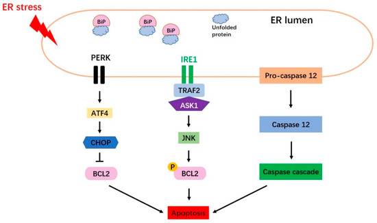 UPR signaling is extremely important for the restoration of ER homeostasis and the maintenance of normal ER function. When misfolded or unfolded proteins accumulate in the ER lumen, UPR signaling is activated to ameliorate this source of ER stress. However, if misfolded or unfolded protein accumulation is persistent and the stress cannot be relieved, apoptosis is induced by activation of the CHOP, Jun N-terminal kinase (JNK), and caspase 12 [25,62,63] pathways (Figure 3).