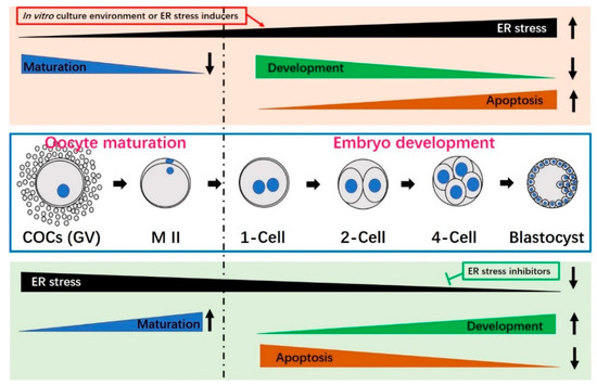 Mammalian oocytes and preimplantation embryos are usually sensitive to variations in many exogenous factors, including temperature, osmotic stress, shear stress, chemical exposure, oxidative stress, etc. [11,43]. All of these factors are known to induce ER stress [17], and reduce embryo developmental potential through alterations in gene expression, epigenetic mechanisms and metabolism [44,45].