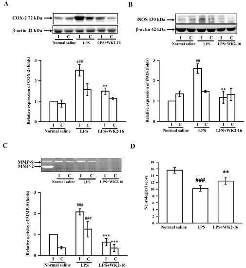 We induced neuroinflammation in C57BL6 mice by intrastriatal injection of LPS (4 μg/3 μL) to analyze the anti-neuroinflammatory effects of WK2-16. As compared with the normal saline group, intrastriatal injection with LPS markedly induced COX-2 and iNOS expression by 2.5 ± 0.3- (p < 0.001) and 2.6 ± 0.2-fold (p = 0.002) in the ipsilateral brain, respectively. Eight hours after intrastriatal LPS stimulation, WK2-16 (30 mg/kg) dramatically attenuated COX-2 and iNOS expression by 1.5 ± 0.2- (p = 0.004) and 1.2 ± 0.3-fold (p = 0.003) as compared to vehicle-treated group, respectively (Figure 1A,B). Cerebral MMP-9 activity, accessed by zymography, was significantly increased by 2.1 ± 0.1-fold (p < 0.001) in LPS-injected group compared to the normal saline-injected group (1.0 ± 0.0-fold). Treatment with WK2-16 significantly attenuated the LPS-increased degradatory activity of MMP-9 in the ipsilateral brain by 0.6 ± 0.2-fold (p < 0.001) (Figure 1C).