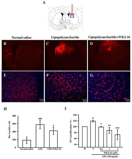 2.2. WK2-16 Inhibited Astrogliosis and Microglia Proliferation in LPS-Challenged C57BL6 Mice