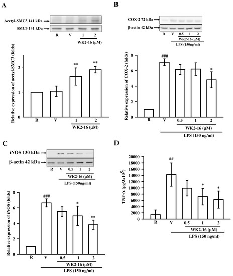 WK2-16 decreased inflammatory enzymes and TNF-α production in LPS-stimulated BV-2 microglial cells. (A) BV-2 cells were incubated with WK2-16 for 2 h, and the acetylation level of SMC3 was determined using Western blotting. (B,C) BV-2 cells were pretreated with vehicle (DMSO) or WK2-16 (0.5, 1, and 2 µM) for 30 min followed by LPS (150 ng/mL) stimulation for 24 h. The expression of COX-2 and iNOS in LPS-stimulated BV-2 cells in the presence or absence of WK2-16 was examined using Western blotting. β-actin was used as the internal control. (D) TNF-α levels in conditioned media of cultured BV-2 microglial cells were measured using ELISA. Values are presented as the means ± SD from three independent experiments. R: resting; V: vehicle. ## p < 0.01, ### p < 0.001 compared to the resting group; * p < 0.05, ** p < 0.01 compared to the LPS-stimulated group treated with vehicle (DMSO).