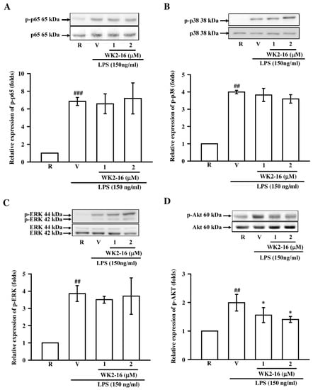 The effects of WK2-16 on LPS-activated pathway signaling in microglial BV-2 cells. Microglial BV-2 cells were pretreated with vehicle (DMSO) or WK2-16 (1 and 2 μM) followed by LPS (150 ng/mL) stimulation for the indicated time. Phosphorylated levels of p65 (A), p38 (B), ERK (C), and Akt (D) in LPS-stimulated BV-2 cells treated with various concentration of WK2-16 were examined using Western blotting. Values are presented as the means ± SD from 3 independent experiments. R: resting; V: vehicle. p-p65: phosphorylated p65; p-p38: phosphorylated p38; p-ERK: phosphorylated ERK; p-AKT: phosphorylated AKT. ## p < 0.01, ### p < 0.001 compared to the resting group; * p < 0.05 compared to the LPS-stimulated group treated with vehicle (DMSO).