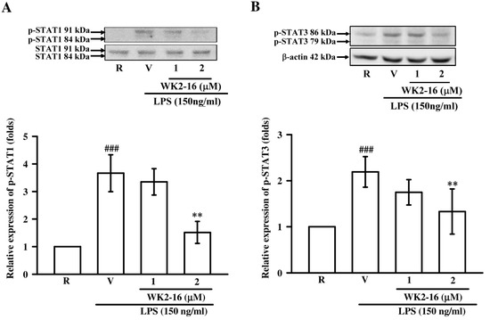 WK2-16 inhibited the activation of STAT-1/-3 in LPS-stimulated microglial BV-2 cells. Microglial BV-2 cells were pretreated with the vehicle (DMSO) or WK2-16 (1 and 2 μM) followed by stimulation with LPS (150 ng/mL) for 3 h. Phosphorylated STAT-1 (n = 3) and STAT-3 (n = 4) were evaluated using Western blotting. The detection of STAT-1 and β-actin were used as the internal controls. R: resting; V: vehicle; p-STAT1: phosphorylated STAT-1; p-STAT3: phosphorylated STAT-3. ### p< 0.001 compared to the resting group; ** p < 0.01 compared to the LPS-stimulated group treated with vehicle (DMSO).