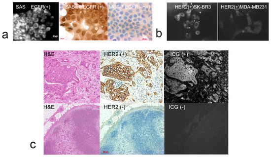 To verify the NIR imaging efficacy of the anti-EGFR affibody probe, the anti-EGFR affibody probe was added to the conditioned medium of SAS cells or MCF-7 cells. Strong NIR fluorescence from the anti-EGFR affibody probe was observed in the SAS cells (positive EGFR expression cell line) in contrast to the negative signal observed from the MCF-7 cells (negative EGFR expression cell line). The EGFR expression status of the cells was confirmed by immunohistochemistry. SAS cells showed positive expression (Figure 1a). SK-BR3 cells showed stronger fluorescence signals in anti-HER2 affibody imaging probes than MDA-MB231 cells (Figure 1b).