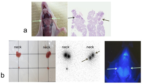 Neck lymph node in normal mouse (a). The arrows indicate neck lymph nodes in dissection. H&E staining showed lymph nodes in the excised cervical tissue (a). Two-phase combined imaging of SLNs in normal mice (b). 99mTc-Phytate and anti-EGFR affibody probe were injected into the tongue of mice. Two excised neck specimens with lymph nodes from two mice are shown (b, left). Autoradiography showed that 99mTc radioactivity accumulated in the lymph nodes of each neck specimen and one solitary lymph node in the corresponding tissues of the left panel (b, middle). NIR fluorescence was localized in the lymph nodes after anti-EGFR affibody probe injection into the tongue (b, right).
