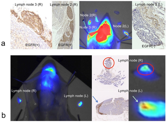 Imaging of metastatic cancer cells in lymph nodes. (a) In a mouse lymph node metastasis model, an anti-EGFR affibody probe was injected into the mouse tongue 24 h prior to sacrifice and lymph node dissection. Six lymph nodes were excised; three lymph nodes were highly fluorescent, and the remaining three lymph nodes were not fluorescent. Immunohistochemical staining for EGFR was found in fluorescence-positive lymph nodes (lymph node 2 (R), lymph node 3 (R)). EGFR expression was not visible in the nonfluorescent lymph node (lymph node 2 (L)). (b) Two lymph nodes, one from each side of the mouse, were dissected 24 h after anti-EGFR affibody probe injection into the tongue. The indocyanine green (ICG) fluorescence signal was obvious and corresponded to the immunohistochemically stained EGFR expression in the lymph nodes (red circles and arrows). The panel on the right is a magnified view of the two lymph nodes in the left panel of the NIR images.