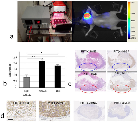 Five-week-old female SHO mice were used for the PIT experiment. After the mice were acclimatized for one week, SAS cells were xenografted subcutaneously in the back or head of the mice. After 3 to 4 weeks, 0.05 mL of affibody PIT probe solution (70.32 μM affibody) was injected into the established tumors. One hour after the injection, the tumors were irradiated using the custom-built NIR illuminator at 200 mW/cm2 and 500 mA 6 times for 10 min/each at an hourly interval. The affibody PIT probe injection and irradiation sessions were performed 3 days a week. As a control, the rest of the tumors were not exposed to NIR irradiation. One hour after the last irradiation, all tumors were removed and fixed with 10% formaldehyde solution. Specimens were embedded in paraffin blocks, and five-µm-thick sections were studied by immunohistochemical staining for EGFR (Envision Kit; Dako, Glostrup, Denmark) using anti-EGFR antibody [31G7, Histofine® Simple Stain™ MAX PO (MULTI), Nichirei, Tokyo, Japan], anti-Ki-67 antibody, and anti-ssDNA antibody as primary antibodies, followed by H&E staining.