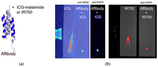 Affibody molecules are shown with randomized positions in the binding site, which are indicated in blue. The molecule was labeled with ICG maleimide or IRDye 700. The figure was adopted from Wallberg H, et al. [46] (a). Thin-layer chromatography (TLC) showed that the fluorescence droplet spots of ICG-conjugated anti-EGFR, anti-HER2 affibody, and IR700-conjugated anti-EGFR affibody (2 µL) stayed at the starting point; in contrast, free ICG and free IR700 ran on the slides (b).