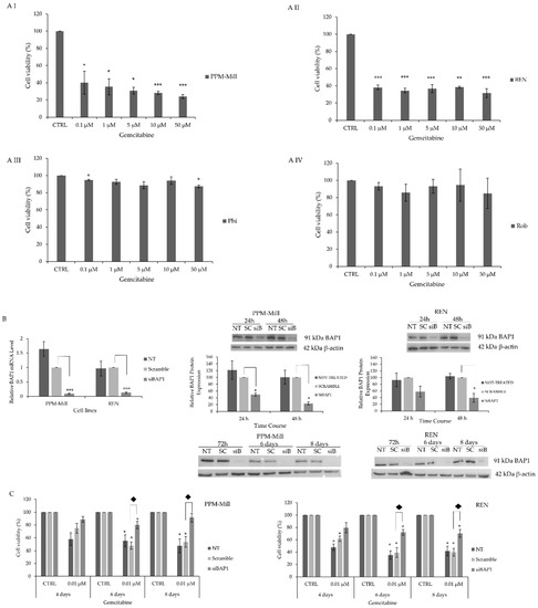 Given the importance of BAP1 in MMe, its potential involvement in chemosensitivity was investigated. Gemcitabine as a conventional treatment was used to assess its cytotoxic effect in BAP1 WT and mutated cell lines. Cell viability of BAP1 WT PPM-Mill and REN was significantly reduced by gemcitabine treatment (Figure 1A, I and II panels) compared to Phi and Rob which bear mutated BAP1 (Figure 1A, III and IV panels). Cell viability of PPM-Mill and REN was reduced by approximately 60% at 0.1 µM of gemcitabine (statistically significant, p < 0.05 and p < 0.01 in PPM-Mill and REN, respectively) compared to control sample (CTRL), while cell viability of Phi and Rob was only slightly reduced by gemcitabine at all tested concentrations, thus showing a poor response. Silencing of BAP1 expression in BAP1 WT PPM-Mill and REN cells—demonstrated using Western blot analysis and qRT-PCR (Figure 1B)—led to a significant reduction in sensitivity to gemcitabine (Figure 1C).