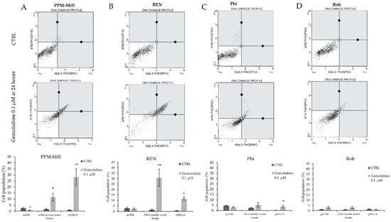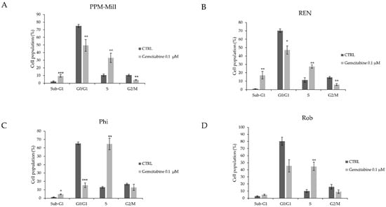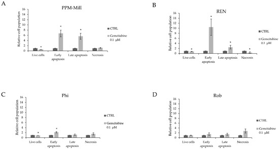 Annexin V assay in PPM-Mill, REN, Phi and Rob cells (A–D) treated with either 0.1 µM gemcitabine or DMSO that was used as vehicle (CTRL), for 48 h, conducted using FACS. Statistical analysis is described in Materials and Methods section. * p ≤ 0.05.
