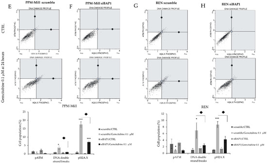 Activation of the DNA damage response can be measured by the phosphorylation of histone H2A.X. DNA damage was assessed in BAP1 WT (Figure 4A,B) and BAP1 mutated cell lines (Figure 4C,D) treated with gemcitabine (0.1 µM) for 24 h. Increased DNA double-strand breaks and γ-Η2Α.Χ phosphorylation were evident in gemcitabine-treated compared to non-treated PPM-Mill cells, whereas no ATM phosphorylation was detected in these cells under the same conditions. Increased DNA double-strand breaks and γ-Η2Α.Χ phosphorylation were recorded in gemcitabine-treated REN cells compared to untreated cells. BAP1 WT cell lines transfected with siRNA targeting BAP1 in combination with gemcitabine (0.1 µM) treatment for 24 h exhibited a significantly decreased percentage of DNA double-strand breaks and γ-Η2Α.Χ phosphorylation compared to scramble transfected (non-targeting siRNA) (Figure 4E–H) and BAP1 WT cells.