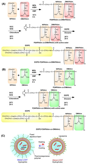 Schemes for the preparation of (A) P(NIPAAm-co-DMAPAAm) modified DOPE and (B) P(NIPAAm-co-DMAAm) modified DOPE. (C) Illustration of a thermoresponsive polymer-modified liposome as an siRNA carrier.