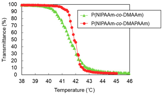 The properties of the synthesized polymers were investigated using gel permeation chromatography (GPC), 1H NMR, and titration (Table 1). The phase transition profiles of the prepared polymers were also measured (Figure 2). GPC showed that the molecular weights of P(NIPAAm-co-DMAPAAm) and P(NIPAAm-co-DMAAm) were 17,000 and 15,000 g/mol, respectively. The molecular weight of the polymers determined by GPC was higher than expected as the polymerization procedure was designed to give polymers with a molecular weight of 10,000 g/mol. It is possible that the determined molecular weights were inaccurate because the calibration of the GPC columns was performed using polyethylene glycol standards, therefore, the molecular weights were also determined by 1H NMR and acid-base titration. We experimentally assessed whether polymer molecular weight determination using 1H NMR or acid-base titration is more accurate than using GPC in this case. The molecular weight of P(NIPAAm-co-DMAAm) was determined by acid-base titration because titration is known to be a relatively accurate method for measuring molecular weight compared with using 1H NMR or GPC. However, it is difficult to determine the molecular weight of P(NIPAAm-co-DMAPAAm) by acid-base titration because P(NIPAAm-co-DMAPAAm) is a weak base. We therefore measured the molecular weight of P(NIPAAm-co-DMAPAAm) by 1H NMR, despite molecular weight observation using 1H NMR being less accurate than titration.