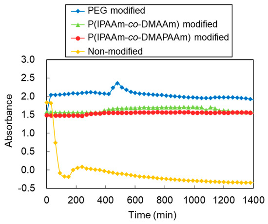 The stability of the liposomes was investigated by measuring the time course of the absorbance of the liposome suspension with human serum (Figure 3). When the liposomes were suspended in serum solution, the suspension exhibited absorbance. In contrast, when liposomes formed aggregates with serum proteins, they tended to settle out of suspension leaving a clear supernatant and reducing the absorbance. The absorbance of the non-modified liposome suspension decreased promptly, indicating that non-modified liposomes tend to aggregate with human serum. In contrast, for liposomes modified with PEG, P(NIPAAm-co-DMAPAAm), and P(NIPAAm-co-DMAAm), the absorbance of the suspension was maintained. This result indicates that polymer-modified liposomes have high stability even in the presence of serum.