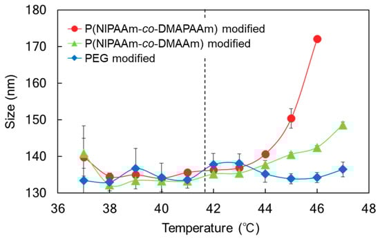The temperature-dependent size change of the liposomes was observed using PBS as the suspension solvent (Figure 4). PEG modified liposomes maintained their size as the temperature was increased. In contrast, P(NIPAAm-co-DMAPAAm) and P(NIPAAm-co-DMAAm) modified liposomes exhibited an increase in size above the LCST of the polymers. At lower temperature, P(NIPAAm-co-DMAPAAm) and P(NIPAAm-co-DMAAm) were hydrated and extended, leading to the formation of an aqueous outer liposome layer, which prevented the aggregation of the liposomes. Above the LCST, the polymers became hydrophobic, which is attributed to dehydration, leading to a reduction in the aqueous layer of the liposomes. The reduced aqueous layer induced aggregation of the liposomes, leading to an increase of the observed liposome size. In addition, above the LCST of the polymers, P(NIPAAm-co-DMAPAAm) modified liposomes exhibited a clear increase in size compared with P(NIPAAm-co-DMAAm) modified liposomes. One possible reason for this observation is the difference in the conformations of P(NIPAAm-co-DMAPAAm) and P(NIPAAm-co-DMAAm) following shrinkage. Above the LCST, both polymers change their conformation to the shrunken state. P(NIPAAm-co-DMAPAAm) has a slight positive charge in the polymer chain, leading to suppression of shrinkage. Therefore, the strong positive charge of the liposome was shielded by the polymer above the LCST, leading to aggregation of the liposomes. In contrast, P(NIPAAm-co-DMAAm) has no positive charge and tends to be compact and shrunken above LCST. Therefore, the strong positive charge of the liposome was exposed, leading to suppression of the aggregation of the liposomes owing to electrostatic repulsion.