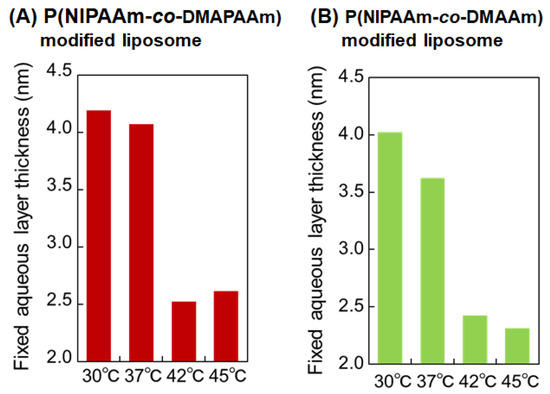 To investigate the aqueous layer of the thermoresponsive polymer-modified liposomes, the fixed aqueous layer thickness was measured at various temperatures using a previously reported procedure [10] (Figure 5). Both of the thermoresponsive polymer-modified liposomes exhibited reduced aqueous layer thickness with increasing temperature. P(NIPAAm-co-DMAPAAm) modified liposomes in particular exhibited notable aqueous layer reduction across the LCST, while the aqueous layer of P(NIPAAm-co-DMAAm) gradually decreased over a broad temperature range from 30 °C to 42 °C. This observation is attributed to the difference in the phase transition properties between P(NIPAAm-co-DMAPAAm) and P(NIPAAm-co-DMAAm). Since P(NIPAAm-co-DMAAm) has a large DMAAm content (30.5 mol %), a broad phase transition proceeded with increasing temperature. In contrast, P(NIPAAm-co-DMAPAAm) contained a low DMAPAAm composition (6 mol %) and exhibited a sharp phase transition temperature. The fixed aqueous layer of P(NIPAAm-co-DMAPAAm) liposomes therefore exhibited a marked decrease across the LCST.