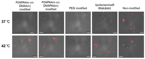 To investigate the temperature-dependent cellular uptake properties of the liposome-siRNA complex, cellular uptake was observed at 37 °C and 42 °C using Alexa fluor 555 labeled siRNA and fluorescence microscopy (Figure 6). Non-modified liposomes tended to aggregate, leading to an uneven distribution outside the cells. PEG modified liposomes were not taken up at 37 °C or 42 °C because the liposomes were relatively hydrophilic. Lipofectamine RNAiMax, a commercially available transfection reagent, was effectively taken up into cells at both 37 °C and 42 °C, and an even distribution of Alexa fluor 555 labeled siRNA was observed in cells. In the case of the temperature-responsive liposomes, cellular uptake of the liposome-siRNA complex was observed at 42 °C, but was not observed at 37 °C. This observation is attributed to the temperature-responsive properties of the polymer on the liposome surface. The P(NIPAAm-co-DMAPAAm) and P(NIPAAm-co-DMAAm) on the liposome surface became hydrophobic at 42 °C, leading to an enhanced hydrophobic interaction between the cells and liposomes. Therefore, the liposome-siRNA complex was taken up into cells at 42 °C. In contrast, thermoresponsive polymer was hydrophilic at 37 °C, leading to prevention of temperature responsive polymer-modified liposome uptake. In addition, a previous investigation reported that the cellular uptake of temperature-responsive liposomes occurred via microtubule-dependent transport and clathrin-mediated endocytosis rather than caveolin-mediated endocytosis [10,11]. These results indicate that the prepared thermoresponsive polymer-modified liposomes can modulate siRNA transfection through simple temperature change.