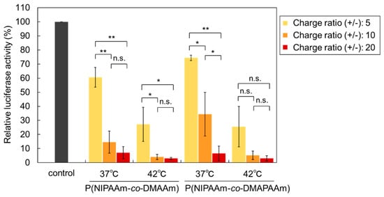 In order to investigate the gene silencing activity of the prepared temperature responsive liposomes, liposome-siRNA complexes were prepared and siRNA transfection was evaluated using luciferase expressing HeLa cells. First, the optimal charge ratio (+/−) of the prepared thermoresponsive liposomes was investigated (Figure 7). Luciferase activity was reduced by increasing the charge ratio (+/−) because electrostatic interaction between the liposome and cell membrane increased with increasing charge ratio (+/−). However, cytotoxicity is expected to increase with increasing charge ratio (+/−). In addition, at high charge ratio (+/−), luciferase activity was high even at 37 °C, indicating that temperature modulation was not effective. In contrast, at a charge ratio (+/−) of 5:1, temperature-modulated gene silencing was observed. Relatively low gene silencing activity was observed at 37 °C, and high gene silencing was observed at 42 °C. The results show that a charge ratio (+/−) of 5:1 provides optimal conditions for temperature-modulated transfection of siRNA.
