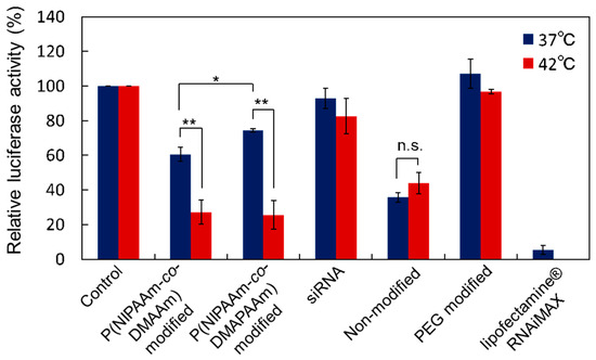 Effect of temperature on gene silencing activity of Luc-HeLa cells transfected with Luc-siRNA. siRNA was transfected for 4 h at 37 °C or 42 °C using liposomes and lipofectamine RNAiMAX. The charge ratio (+/−) was 5:1 and the siRNA concentration was 25 nM. The data are mean ± standard deviation (SD). (n = 3 or 4, ** p < 0.01, * p < 0.05, and n.s.: not significant).