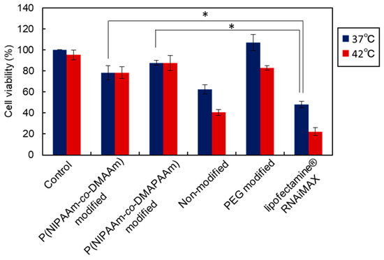 Cell viability after the siRNA transfection was evaluated by WST-8 assay (Figure 9). Non-modified liposome and Lipofectamine RNAiMax reduced the cell viability, which is likely a result of the cationic properties of the non-modified liposome and Lipofectamine RNAiMax. In contrast, thermoresponsive liposomes exhibited high cell viability compared with the non-modified liposome and Lipofectamine RNAiMax. This is likely because the modified polymer on the liposome surface suppressed the cytotoxicity of the cationic liposome. In addition, P(NIPAAm-co-DMAPAAm) modified liposome exhibited a slightly higher cell viability compared with P(NIPAAm-co-DMAAm) modified liposome. This result indicates that P(NIPAAm-co-DMAPAAm) modified liposome has a high transfection ability as well as low cytotoxicity. Therefore, P(NIPAAm-co-DMAPAAm) modified liposome is an appropriate temperature-responsive siRNA carrier.
