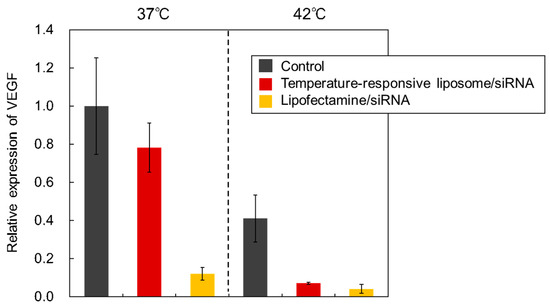 Suppression of the VEGF expression of HeLa cells was carried out using P(NIPAAm-co-DMAPAAm) modified liposomes (Figure 10). If VEGF expression of cancer cells in vivo is suppressed, angiogenesis and cancer cell growth can be prevented, leading to the possibility of using liposome-siRNA complexes as anti-cancer therapeutics. VEGF expression was estimated from the mRNA of VEGF. The VEGF expression was suppressed at 42 °C compared with the 37 °C case. Previous reports have indicated that the VEGF expression of tumor cells was suppressed by heating at hyperthermia [44]. Therefore, the suppressed VEGF expression at 42 °C was reasonable. Using temperature-responsive liposomes as siRNA carriers for silencing VEGF expression effectively suppressed VEGF expression at 42 °C, which is the same as was found when Lipofectamine RNAiMax was used as the siRNA carrier. This result indicated that temperature-responsive liposomes can modulate VEGF expression of cancer cells with temperature change, leading to the possibility of suppressing VEGF expression of cancer cells in vivo, thereby inhibiting cancer cell growth.
