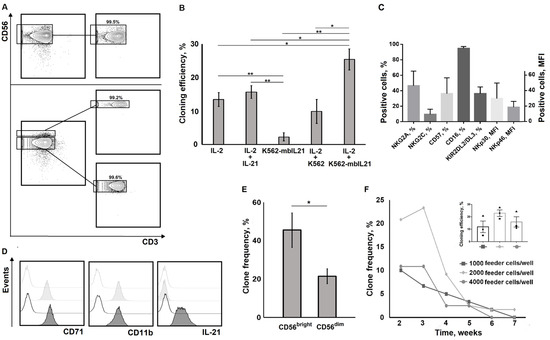 Selection and optimization of the natural killer cells (NK cells) cloning method. (A) Gaiting strategy for sorting individual NK cells and purity of resulted cell fractions (1—whole NK cell population; 2— cluster of differentiation (CD) 56bright and CD56dim subsets). Staining of magnetically separated NK cell fraction was performed with CD56 and CD3. (B) The efficiency of clone formation (cloning efficiency) using different stimuli. Mean ± SE of n independent experiments is presented (n = 3 for IL-2; n = 4 for IL-2 + IL-21; n = 3 for gene-modified K562 feeder cells expressing membrane-bound IL-21 (K562-mbIL21); n = 3 for interleukin (IL)-2 + K562; n = 5 for IL-2 + K562-mbIL21). (C) Phenotypic analysis of ex vivo NK cells before sorting. Mean ± SD of NK cell samples of eight individuals is shown. (D) Comparative phenotypic characterization of K562 (light grey) and K562-mbIL21 (dark grey) cells. CD71, CD11b, and IL-21 staining and isotype controls are presented. (E) CD56bright NK cells generate more clones than CD56dim. Data of four clone collections are presented in each column. (F) Selection of the number of K562-mbIL21 feeder cells for obtaining human NK cell clones. Cloning efficiency was calculated as clone frequency at the indicated week, when the greatest number of clones was detected in a collection. Data of three independent experiments are presented in the columns. NK cells of three donors (indicated by different symbols) were independently cloned. Significant differences are shown by asterisks as * p < 0.05; ** p < 0.01.