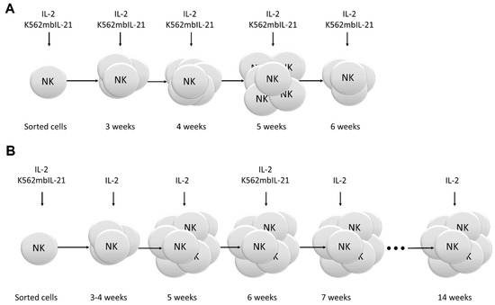 Every week beginning from week three, 100 µL of the medium was substituted with the same volume of suspension containing complete NK cell medium with 100 unit/mL of recombinant IL-2 (Sigma-Aldrich, St. Louis, MO, USA) and 104/mL of irradiated K562-mbIL21 feeder cells (Figure 2A).