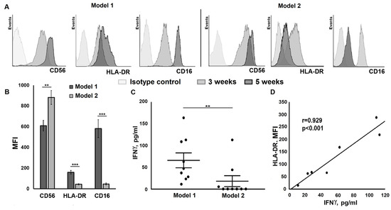 Expression of surface markers and interferon-γ (IFN-γ) production by NK cell clones depends on the cultivation model. (A) Dynamics of surface markers expression in NK cell clones cultivated according to model 1 and model 2. Measurements were carried out at weeks three and five of cultivation. (B) Differences in the expression of CD56, human leukocyte antigen-DR isotype (HLA-DR), and CD16 in NK cell clones cultivated using models 1 and 2 (measurements were carried out at week 5). (C) Comparison of the level of IFN-γ in supernatants of clones cultivated according to models 1 and 2 (from 22 to 67 independent clones were analyzed in each type of measurement). (D) Correlation between HLA-DR expression level and IFN-γ production in clones cultivated using model 1. (C,D) Measurements were carried out at week four of clone cultivation. Significant differences are shown by asterisks as ** p < 0.01; *** p < 0.005.