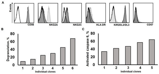Analysis of the phenotype and functional activity of long-lived NK cell clones. (A) Phenotypic analysis of NK cells clones performed at week 10 of culturing. Two phenotypic patterns (light grey and dark grey) are shown. (B) Degranulation of the clones, measured by the level CD107a expression on the cell surface after incubation in the presence of K562 target cells at week 14 of cultivation. (C) The efficacy of natural cytotoxicity of the clones, measured by caspase-6 activation in K562 target cells at week 14 of cultivation.